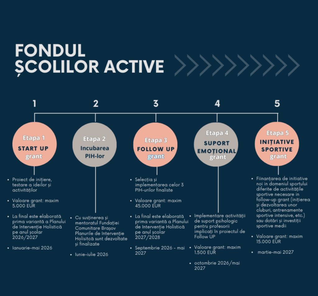 În cadrul apelului de Start-up al programului Fondul Școlilor Active lansat astăzi se acordă finanțări în valoare totală de 15.000 euro pentru proiecte educaționale propuse de școli, menite să se implice activ în diminuarea rămânerilor în urmă în ceea ce privește cititul/ scrisul/ socotitul și dezvoltarea competențelor la nivelul cerut de programa educaţională naţională prin intermediul îmbinării activităților remediale cu cele sportive. Programul se adresează copiilor cu vârste cuprinse între 6 și 8 ani în comunități aflate în risc socio-educațional mediu sau ridicat și are ca scop prevenirea abandonului școlar și creșterea interesului pentru educație în rândul acestor copii.