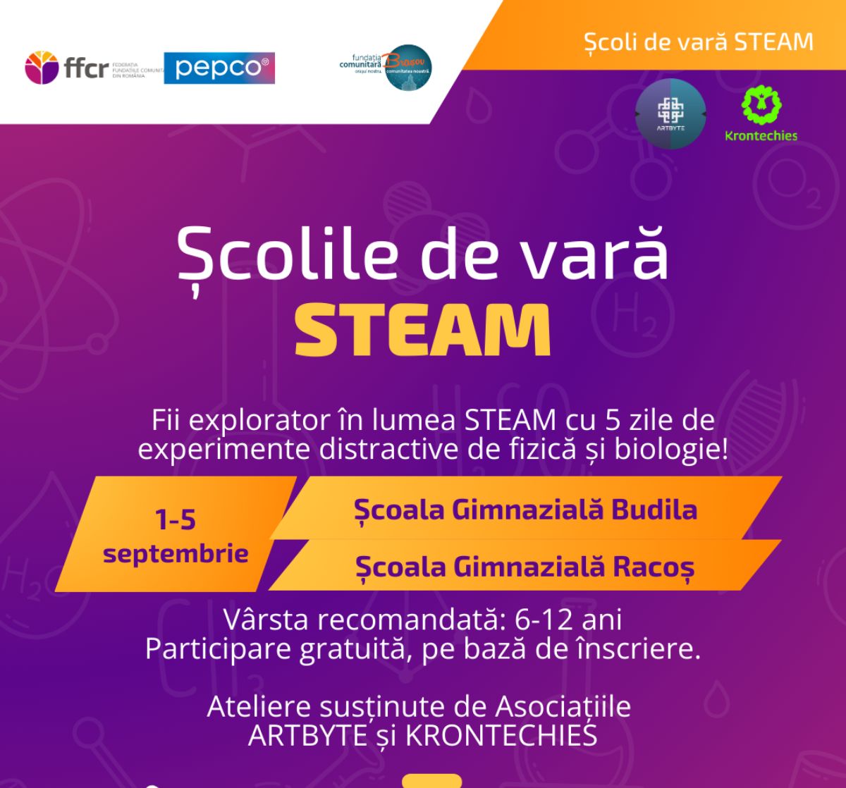 Fundația Comunitară Brașov anunță cu bucurie lansarea a două Școli de Vară STEAM gratuite pentru copii, organizate în parteneriat cu asociațiile ARTBYTE și Krontechies în perioada 1 - 5 septembrie 2025, în localitățile Racoș și Budila din județul Brașov. Activitățile sunt gândite să aprindă curiozitatea copiilor...